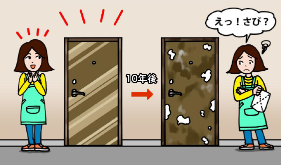 設置10年のアルミ製玄関ドアの表面が白くぽつぽつと変色した部分があるのですが不良品ではないですか?交換して欲しいです。